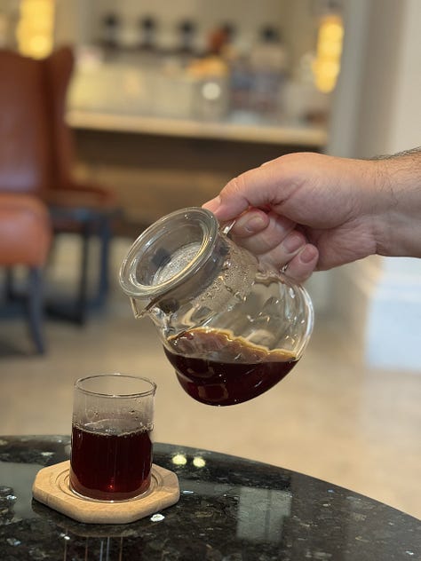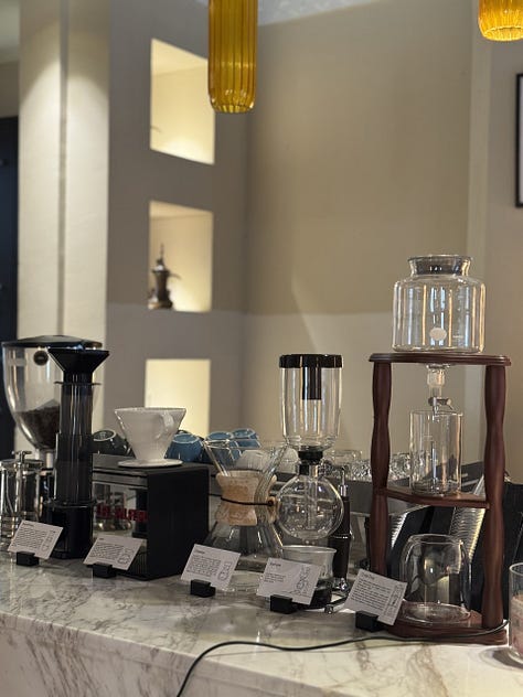 La Al Bareed Café nu o să găsești doar tradiționala cafea arăbească în meniu ci poți comanda orice, de la espresso, la cappuccino și până la V60, aeropress, chemex sau syphon. Au cafea de specialitate, inclusiv cea folosită la prepararea cafelei arabe, de la Three Coffee Roasters, una dintre cele mai bune prăjitorii de cafea din Dubai.