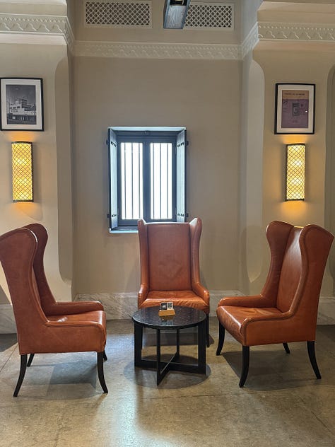 Am stat, la început, la mesele din față, am intrat apoi și m-am cufundat într-un scaun de la o masă din interior, după care am ieșit și pe terasa interioară. Acum, Al Bareed Café este parte a hotelului The Chedi Al Bait, iar terasa interioară este absolut superbă.