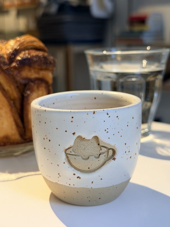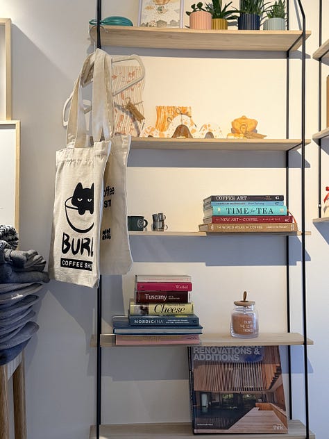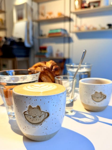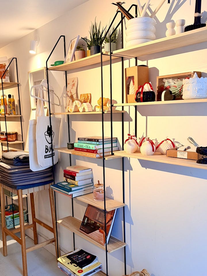 În plus, dacă îți aduci aminte că ai uitat să să iei un cadou pentru cineva să știi că au aici diverse chestii drăguțe de la Madalinsky și multe alte produse artizanale de la producători locali. Sau poți să cumperi o cafea și o cană cu logoul cafenelei care este o pisică într-o ceaşcă de cafea. Mergi la sigur, îți zic. Acum că scriu asta, chiar îmi pare rău că nu mi-am cumpărat două căni să le adaug la colecția de acasă, dar nicio problemă, rezolv data viitoare. ☕